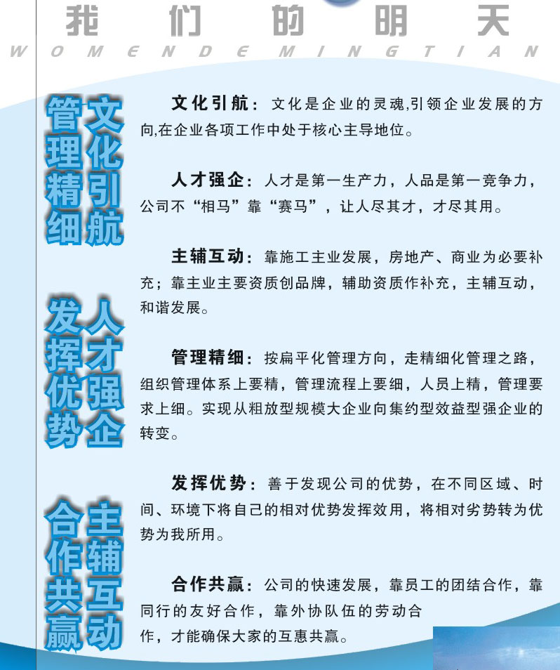 4、企業(yè)文化是企業(yè)發(fā)展戰(zhàn)略規(guī)劃的重要組成部分,公司的發(fā)展戰(zhàn)略是:文化引航、人力強(qiáng)企、主輔互動(dòng)、精細(xì)管理、發(fā)揮優(yōu)勢(shì)、合作共贏。